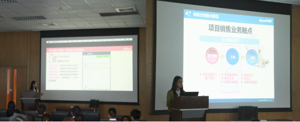 第一场培训为《云客移动销售系统培训》,凡雪娟讲师分置业顾问和销售经理两种不同角色分别讲解云客系统日常操作流程,云客系统可作为置业顾问的跟客秘书,在系统中可以编辑和跟进客户信息,及时查看房源和业绩;云客系统可作为销售经理的案场管家,销售经理可以查看案场的数据统计,也可在系统上直接分配可和进行房源销控。第二场培训为《明源销售系统培训》,郑楠讲师从房源查询、认购管理和变更管理三个部分介绍销售认购环节的明源系统操作流程。