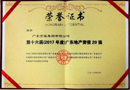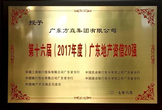 会上工、农、中、建四大国有银行广东省分行等机构正式对外公布了“第十六届(2017年度)广东地产资信20强”名单。该名单涵盖了20家广东本土龙头房企,方直集团以守信创新的企业精神及成熟稳健的资产运作能力,再次蝉联“广东地产资信20强”称号,成为连续四年蝉联该项荣誉的房地产企业之一。