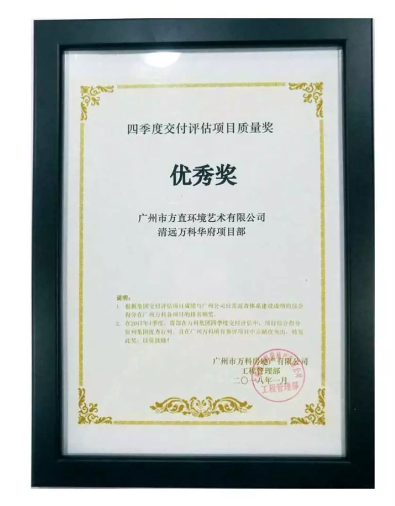 2018年1月荣获2017年四季度交付评估项目质量优秀奖(清远万科华府)
