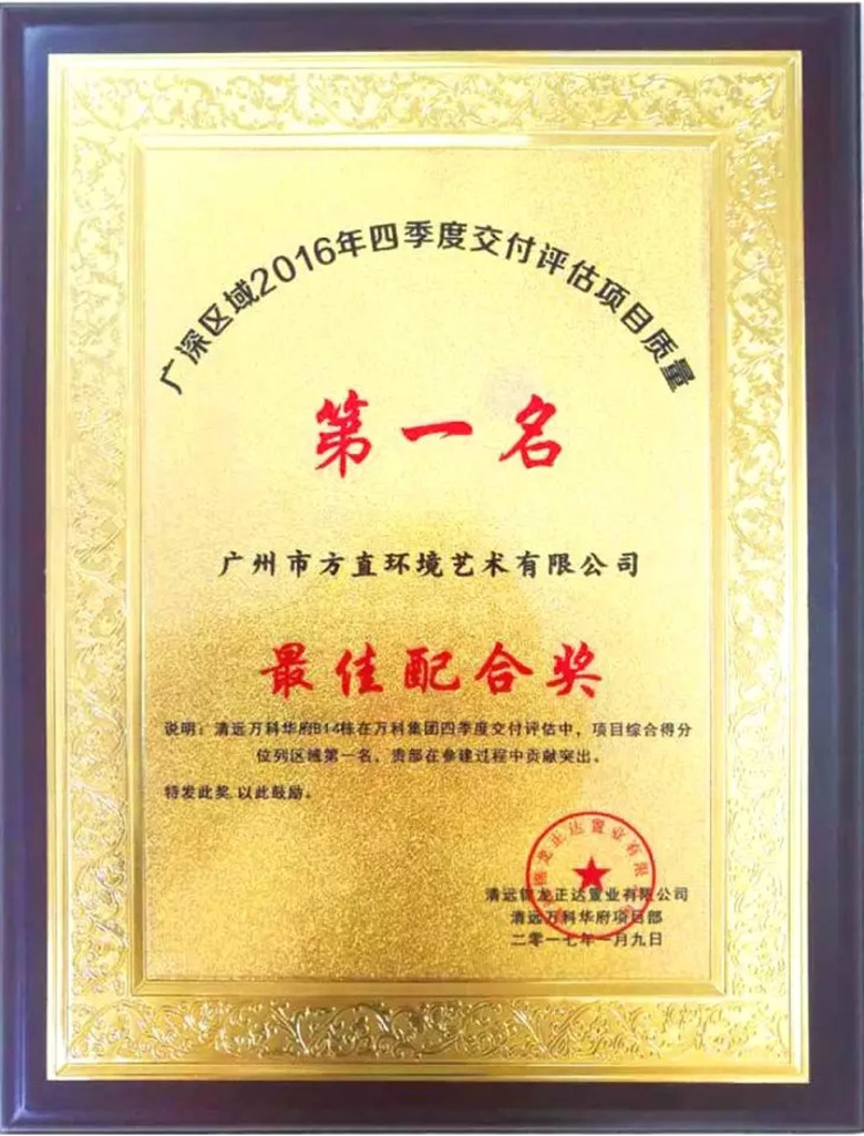 2015年10月荣获2015年三季度最佳合作方(清远万科华府)