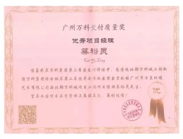 方直环境-佛山万科城项目经理部-蔡武泰荣获优秀项目经理表彰奖项!