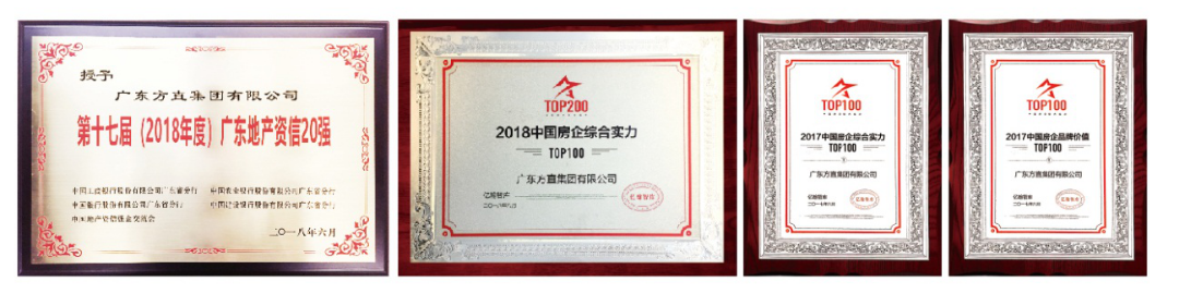 凭借诚实守信、持续创新、稳健的资本运作能力,方直集团赢得了行业和资本的认可和赞许。2014-2018年,方直集团连续五年蝉联“广东地产资信20强”。 2018年,更是凭借着稳步提升的综合实力,荣列“2018中国房企综合实力TOP100、2018中国房企品牌价值TOP100”榜单。