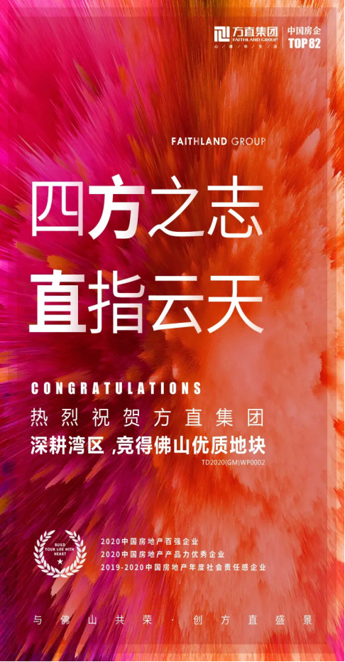 5月19日,方直集团竞得佛山市TD2020(GM)WP0002商住地块。地块总占地158亩,容积率2.79,总计容面积293610㎡。地处佛山高明区荷城,紧邻高明河,是高明未来重点发展片区之一。地块周边还有沧江水上综合运动基地、南海湾森林生态园及其他生活教育等配套。