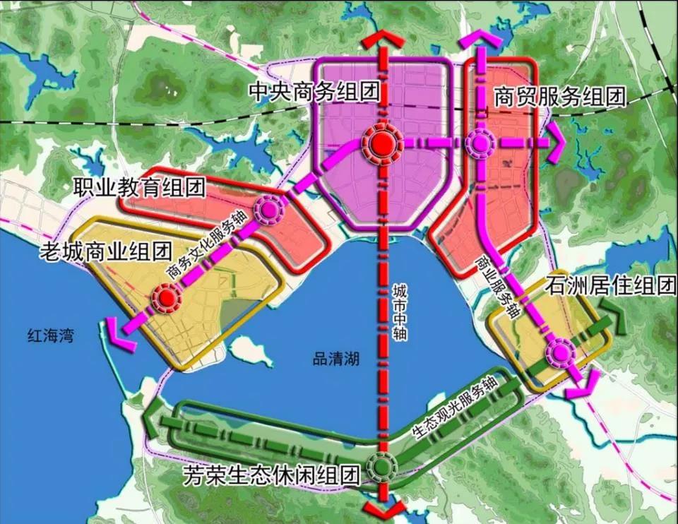 汕尾城市中轴线以汕尾高铁站为起点,沿着中轴西路(建设中)、站前横路、汕尾大道等城市主干道向四周延伸,一直延伸至品清湖。