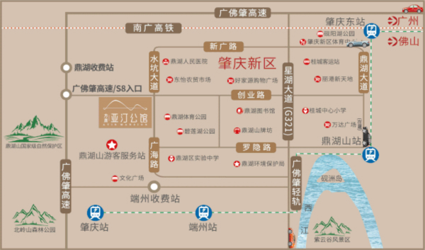 2、高铁:广州南站→佛山西站→肇庆东站→坐车至方直亚汀公馆