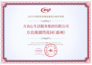 方直心生活凭借多年在粤港澳大湾区的砥砺耕耘,荣膺“2021物业服务力大湾区TOP100”第38名,其中方直珑湖湾花园(惠州)项目被评为“2021大湾区住宅物业服务力标杆项目”。
