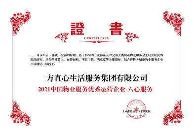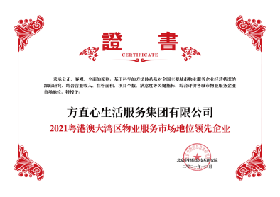 活动现场,中指研究院对2021年度物业服务市场地位领先、物业服务特色运营等企业进行了表彰,依靠多年在粤港澳大湾区的品质运营,方直心生活服务集团荣获“2021粤港澳大湾区物业服务市场地位领先企业”、“2021中国物业服务优秀运营企业-六心服务”两项大奖。
