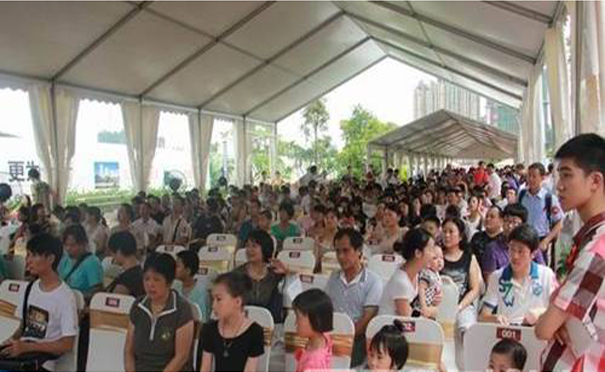 7:00——活动现场十分热闹,现场几百批客户在营销中心外排队等候购房,售楼处外搭建的开盘仪式大棚内更是座无虚席。