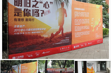 2012年10月29日,方直2013年“心力量”校园招聘宣讲会在重庆大学建设管理与房地产学院楼514激情上演。宣讲会开始前,综合楼前的大型背景板,教学楼门口、校道横幅,楼道转角处X展架等准备布置,良好的营造了宣讲会的场地氛围。